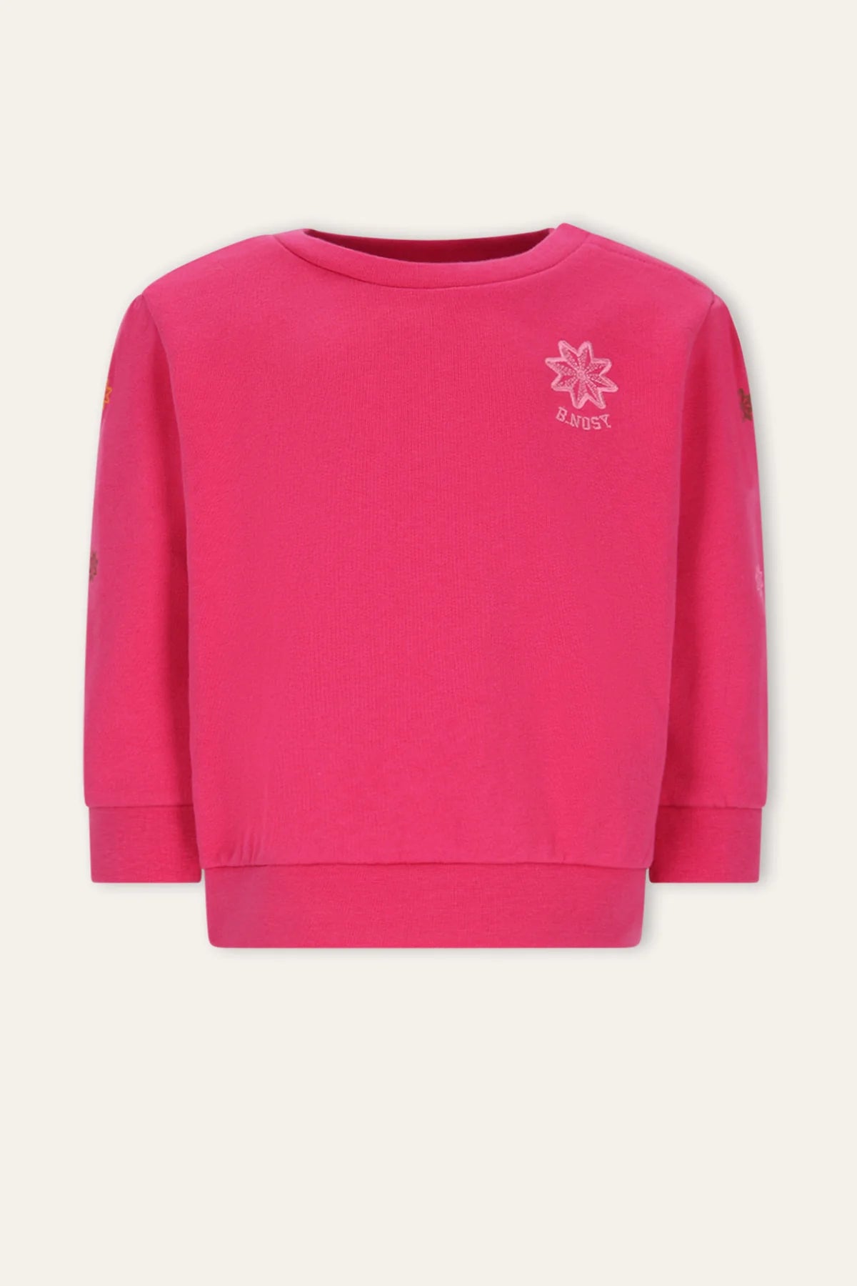 De B.Nosy Mini Sophie Sweater is een schattige en comfortabele keuze voor kleine meiden! Deze roze sweater met bloemetjesprint op de mouwen staat perfect bij het broekje Pepper en zorgt ervoor dat je kleintje er stijlvol uitziet. Gemaakt van biologisch katoen, heeft dit item een heerlijk zachte pasvorm. Perfect voor speelse dagen of casual uitjes. Deze trendy sweater is een must-have voor elk modebewust meisje. Scan de QR-code om de reis van het kledingstuk te ontdekken!