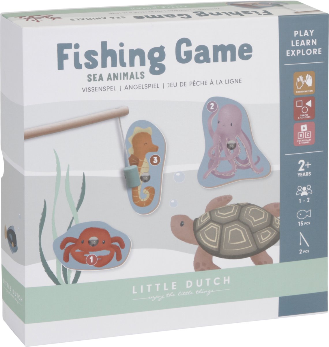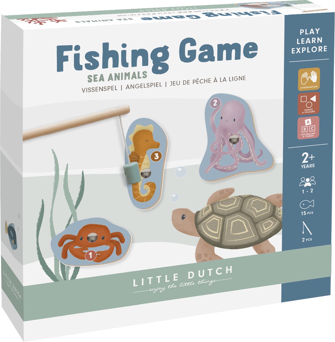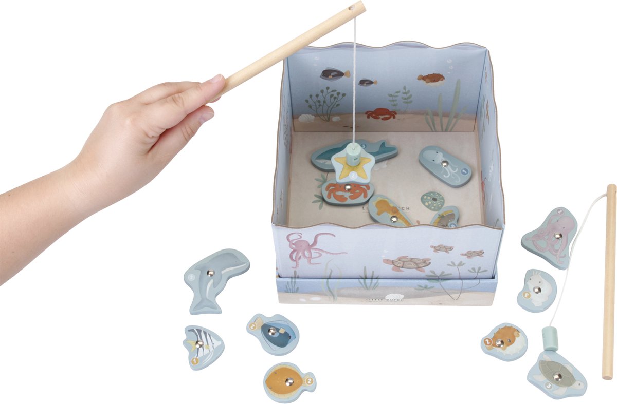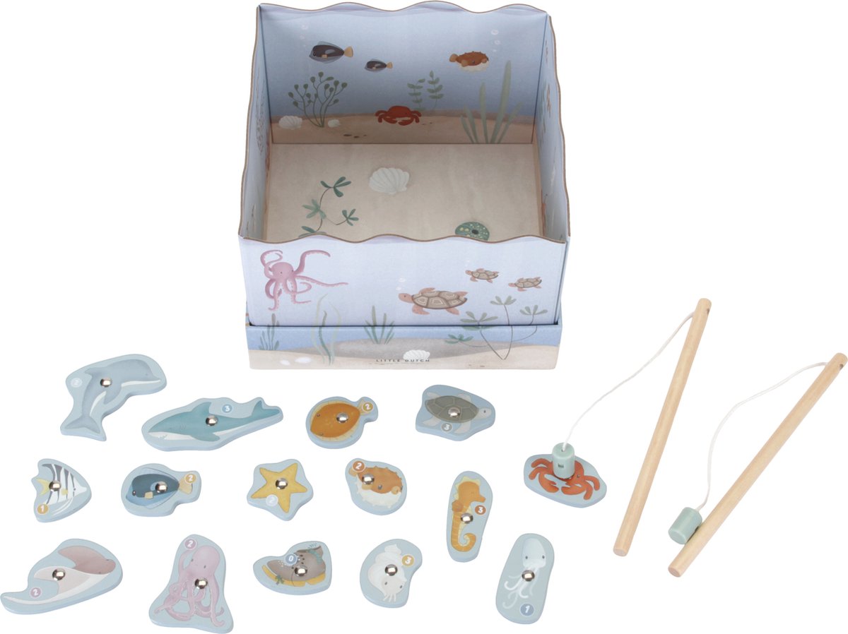 Vang jij de meeste onderwaterdieren met dit leuke hengelspel van Little Dutch? Pas wel op dat je niet de oude schoen aan je hengel krijgt! Dit klassieke hengelspel stimuleert de fijne motoriek en de concentratie van kinderen. Bovendien kan het spelniveau aangepast worden aan de leeftijd van de spelers, zodat zowel jonge als oudere kinderen er veel plezier aan beleven. De onderwaterdieren zijn van hout gemaakt en het aquarium is van karton. Vanaf 2 jaar.