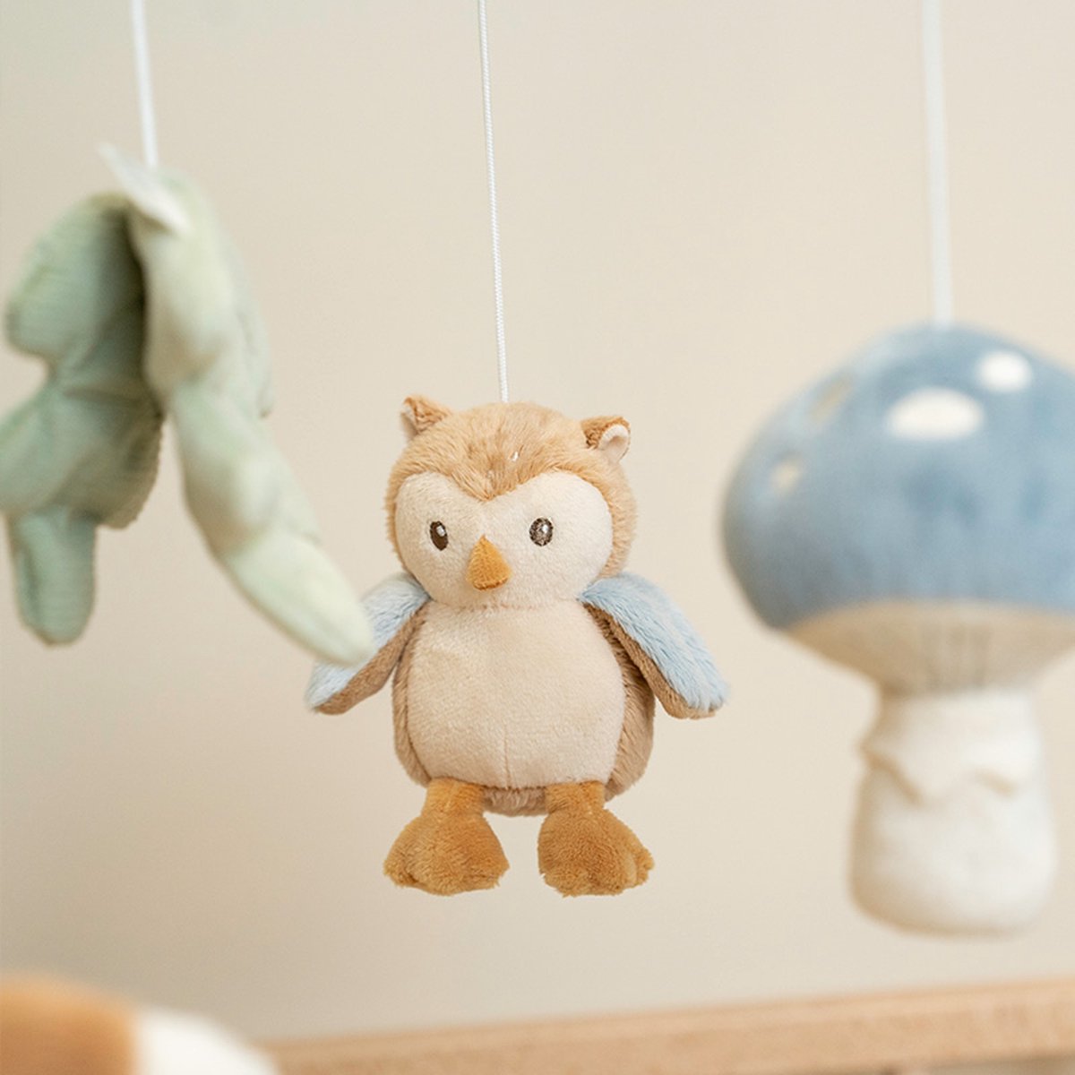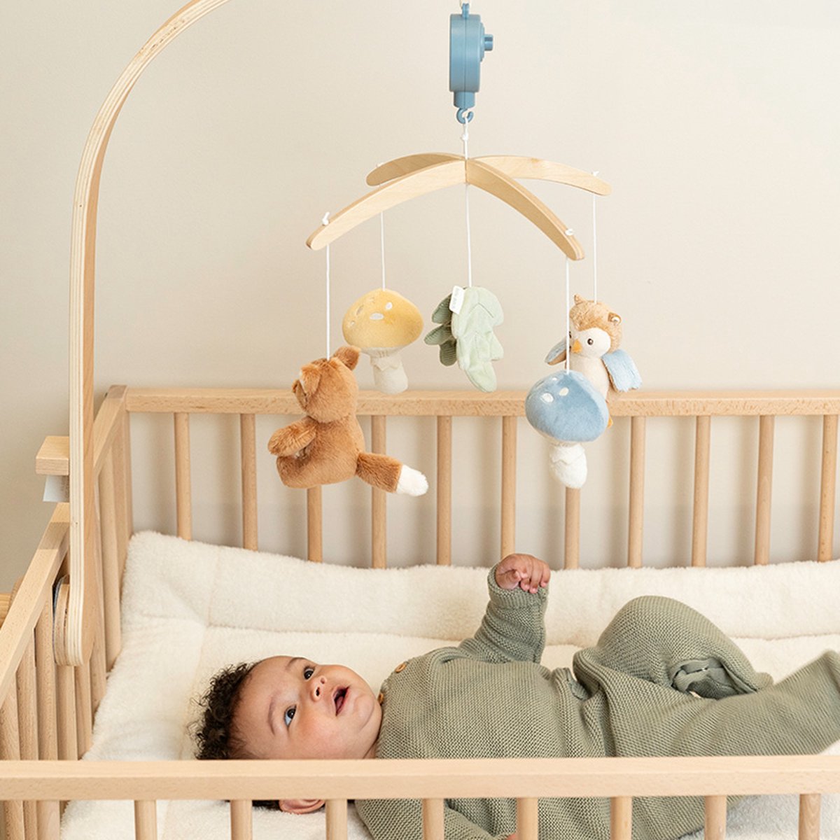 Volg het geluid en kijk hoe het hertje en het vogeltje ronddraaien. Deze mooie houten muziekmobiel werkt rustgevend voor baby’s dankzij het lieve slaapliedje. Aan de mobiel hangen vijf speeltjes uit de Fairy Garden collectie: een hertje, aardbei, bloem, paddenstoel en vogel. Baby’s kijken graag naar de beweging van deze speeltjes, wat hun visuele ontwikkeling stimuleert. De muziekmobiel is geschikt vanaf de geboorte en eenvoudig te bevestigen aan het kinderbed of de box.