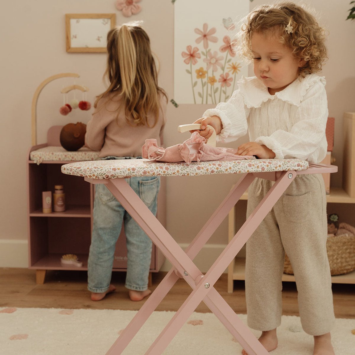 Strijken zoals de groten! Met deze prachtige houten strijkplank en het bijpassende strijkijzer kunnen kleintjes de kleertjes van hun poppen of knuffels keurig glad strijken. De plank is inklapbaar, waardoor hij gemakkelijk kan worden opgeborgen. Een perfecte toevoeging aan het rollenspel en een geweldige manier om huishoudelijke taakjes spelenderwijs te ontdekken!
