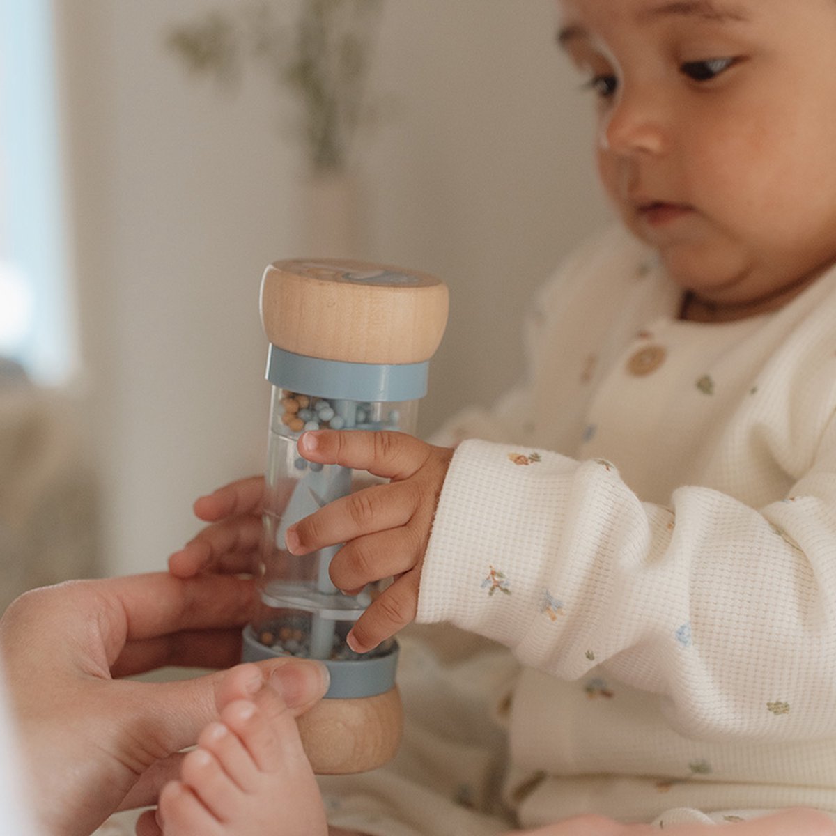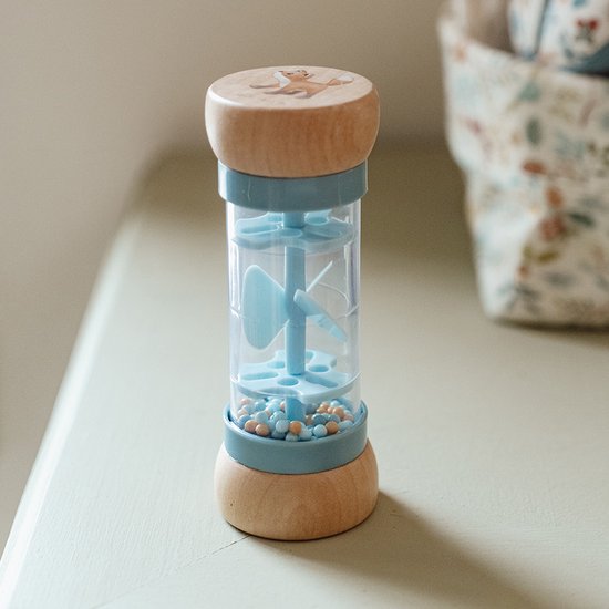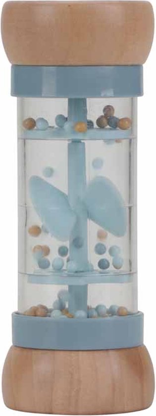 Schud en rammel! Draai de regenrammelaar om en luister naar de rustgevende druppelgeluidjes van de balletjes die van de ene naar de andere kant van de regenmaker bewegen. Het stimuleert de zintuiglijke ontwikkeling en het muzikale talent van je baby. De balletjes, vallen door kleine openingen in de buis en laten de propeller draaien, wat resulteert in een aangenaam geluid. De regenrammelaar is ontworpen voor kleine handjes en ligt lekker in de hand. De houten boven- en onderkant zijn versierd met een illustratie van een klein vosje en een paar paddenstoelen en uit de Forest Friends -collectie. Gemaakt van FSC-gecertificeerd hout. Leeftijd: vanaf 12 maanden.