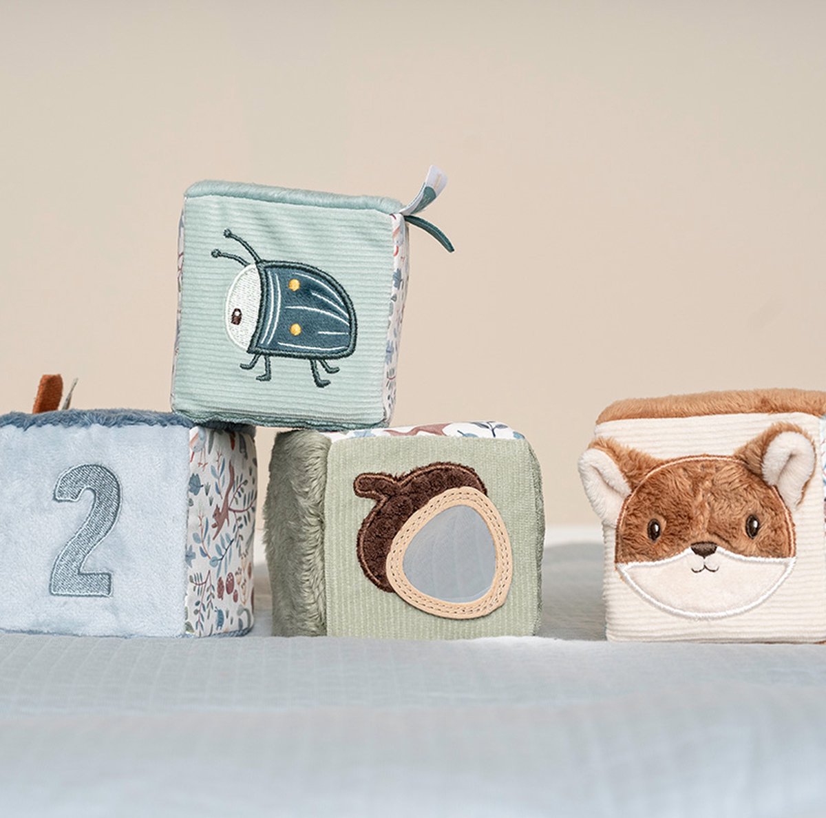 Ring, ring, ratel. Met verschillende geluiden, texturen en kleuren om te ontdekken zal deze vrolijke set zachte activiteitenblokken uit de Forest Friends collectie je kleintje uren bezighouden. Daarnaast wordt de hand-oogcoördinatie van je kindje spelenderwijs gestimuleerd. De set bestaat uit vier zintuiglijke blokken, elk met een eigen zachte kleur en een uniek nummer. Babyhandjes zullen daarnaast leuke labels, pluche panelen en een spiegeltje ontdekken.